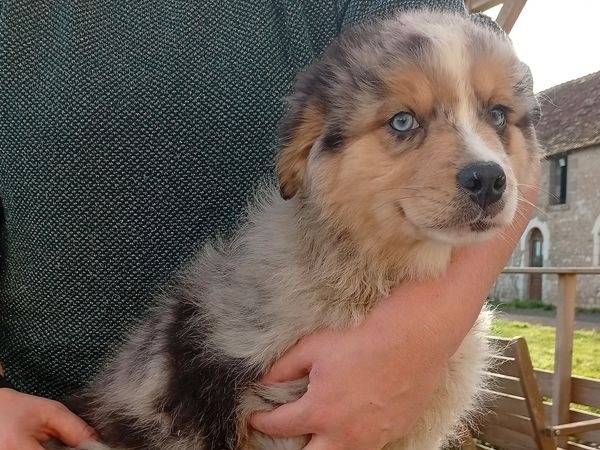 Nous proposons à la vente quatre Bergers Australiens issus d’une portée récente de six, élevés dans notre maison. Une femelle bleu merle, une autre noire tricolore, une dernière rouge tricolore et un mâle noir tricolore sont disponibles.
