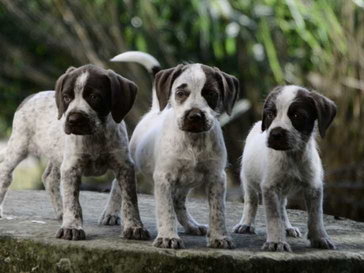 Sur une portée de six chiots Labradors croisés Drathaars, il nous reste quatre femelles au pelage chocolat et blanc. Celles-ci, issues d'un père Labrador et d'une mère Drathaar, sont âgées de trois mois et peuvent quitter l'élevage dès maintenant.