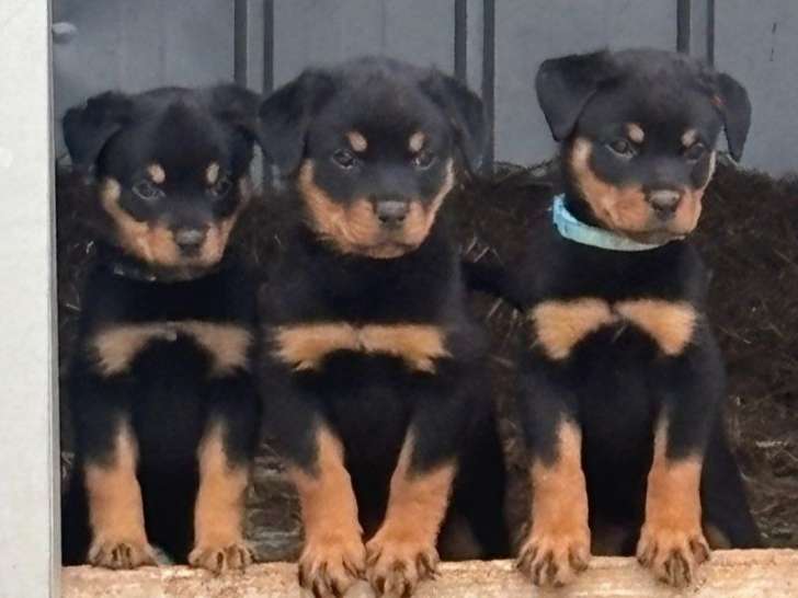 Pour 1000 euros, adoptez l'une de nos quatre magnifiques chiots femelles Rottweilers issues d'une portée de huit petits. Elles arborent la robe noire et feu caractéristique et atteindront un poids conséquent une fois adultes.