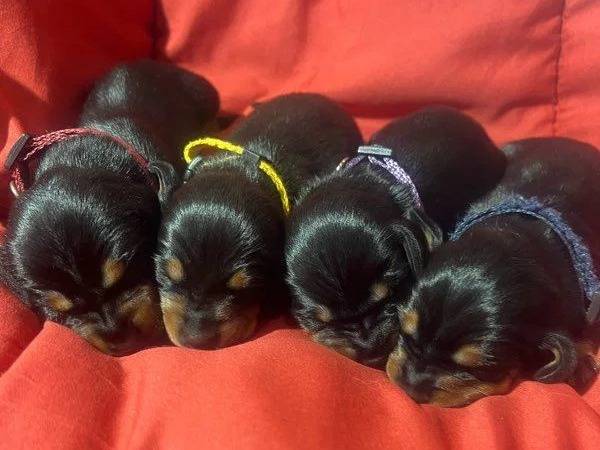 Ces quatre chiots arborent une robe noire et feu. Leur mère est une jeune chienne confirmée à la robe arlequin silver, et leur père est un mâle confirmé importé d'Italie.