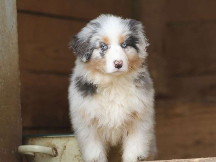 Pour 1300 euros, adoptez l'un de nos six magnifiques chiots Bergers Australiens nés le 24 novembre 2025. Nous proposons des mâles et des femelles bleu merle aux yeux bleus ou noisette, et un mâle noir...
