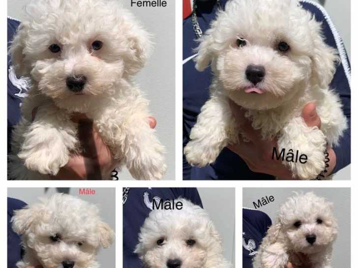 Nous mettons à la vente 5 chiots Bichons Frisés blancs issus d’une portée de 5 nés le 10 decembre 2022, disponibles.