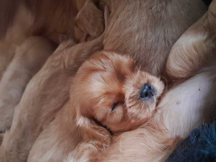 Notre élevage vous annonce une portée de cinq chiots Cavalier King Charles nés le 15 octobre 2025. Trois femelles et deux mâles, de petits gabarits, grandissent dans la maison.