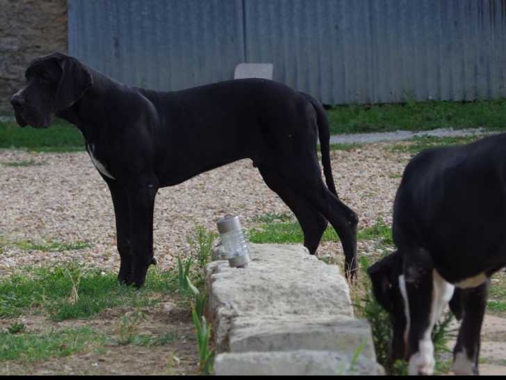 Sur une portée de 14 née le 21 mars 2022, nous avons encore cinq chiots Dogues Allemands disponibles à la vente. Ce sont deux mâles et deux femelles noirs ainsi qu’une autre tricolore. Ils sont tous enregistrés dans le Livre des Origines Français (LOF).