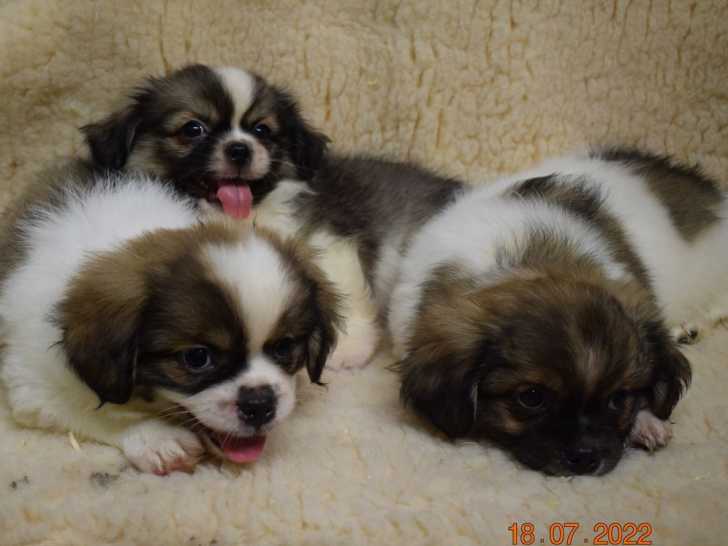 Vous pouvez acheter tout de suite votre compagnon parmi nos cinq chiots Épagneuls Tibétains, nés le 16 mai 2022. Votre choix se portera entre quatre mâles et une femelle bicolores. Ils ne sont pas déclarés au Livre des origines Français (LOF).