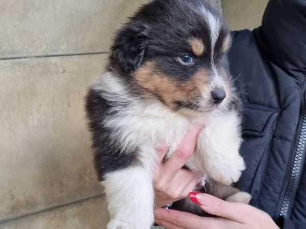 Nous rendons disponible à la réservation une portée de 5 chiots Bergers Australiens : 3 mâles tricolores et 2 mâles bleu merle nés le 03 décembre 2021.