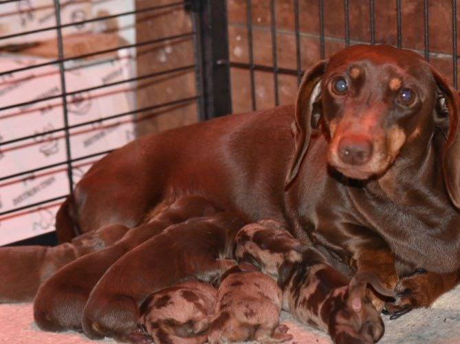 Notre élevage présente une portée exceptionnelle de Teckels Nains, élevés en famille. Six petits arlequins et chocolat sont disponibles pour le 11 décembre.