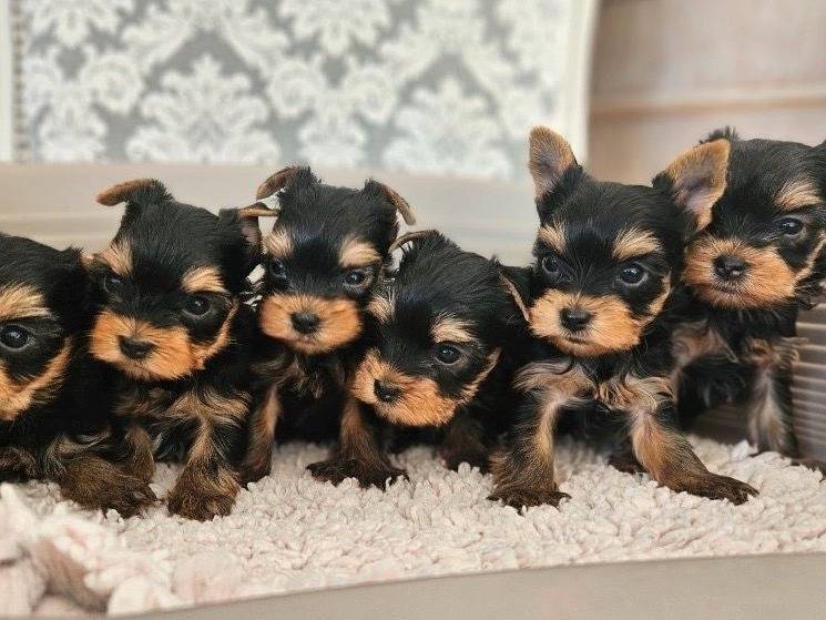 Notre portée de six chiots Yorkshire Terriers, nés le 30 novembre 2025, est issue d'une lignée sélectionnée pour le type "tête de poupée". Cinq mâles et une femelle, au gabarit petit à standard, sont disponibles à la réservation.