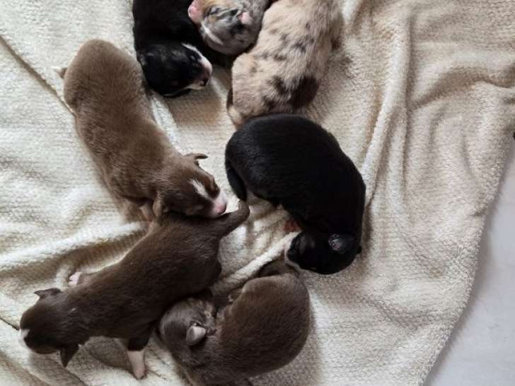 Nous vous invitons à choisir votre compagnon parmi 7 adorables chiots Bergers Australiens nés le 12 janvier 2025. Sur cette belle portée, 1 femelle rouge merle, 3 mâles rouge merle, 2 femelles rouge tricolore...