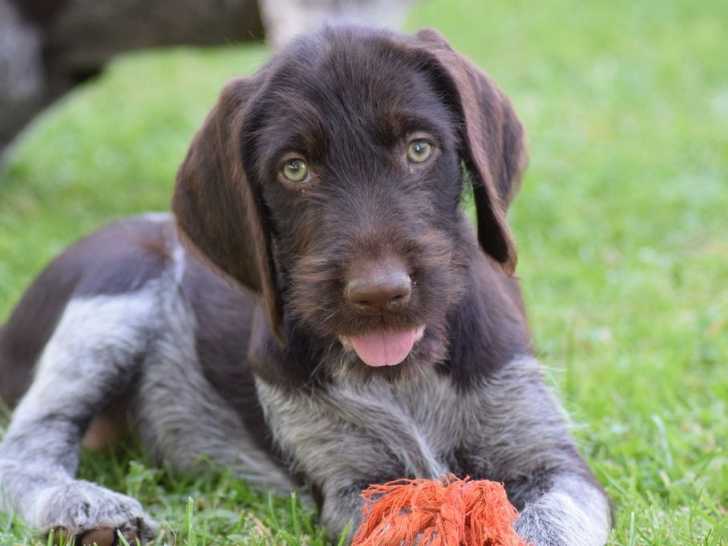 Nous mettons en vente des chiots Drahthaars nés le 18 mai 2022 : 4 femelles et 3 mâles, de robe noir et blanc bringé ou chocolat et blanc bringé.