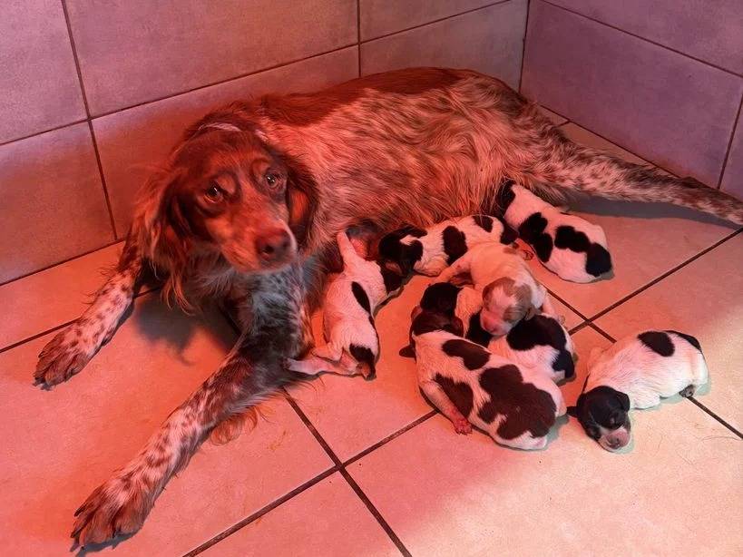 Notre élevage CANY EXPRESS propose une portée de sept chiots Épagneul Breton, inscrits au Livre des Origines Français (LOF), nés le 26 mars 2026 des parents ROUSSETTE et ROCCO.