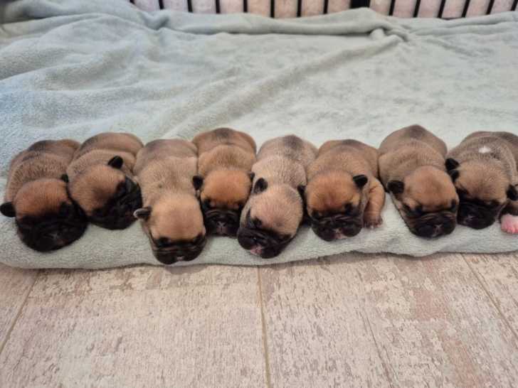 Des chiots Bouledogues Français au pelage fauve sont disponibles à la réservation à l’élevage Des Trésors De Provence, 4 femelles et 4 mâles provenant d’une portée de 8.