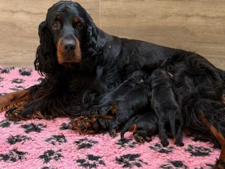 Cinq femelles et six mâles Setter Gordons nés le 28 décembre 2025 sont à réserver. Ces petits grandissent en famille et sont parfaitement habitués aux bruits du quotidien pour une sociabilisation...