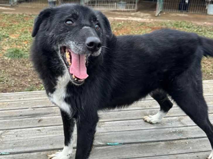 De couleur noire avec marque blanche, Blacky est un chien âgé de treize ans qui aspire à trouver un foyer bienveillant prêt à lui offrir une belle vie.