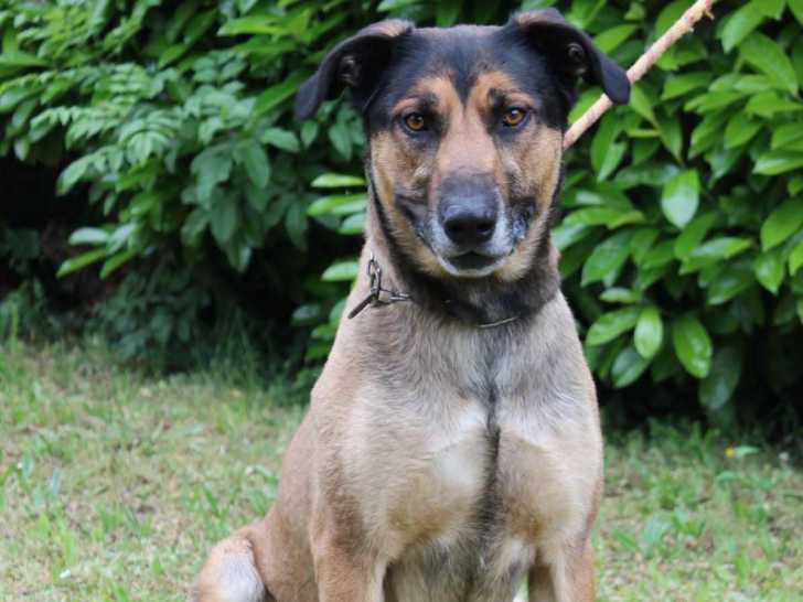 Nous vous proposons à l'adoption ce chien noir et beige de quatre ans nommé Atlas. Cherchant une famille qui lui offrira une belle vie, il n’aime pas vivre avec ses congénères mâles.