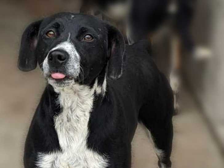 Nous vous proposons à l'adoption Tac, un chien noir et blanc âgé de deux ans qui recherche une famille aimante prête à prendre soin de lui.