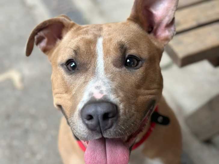 De couleur fauve, Ulka est une chienne e Staffordshire Américain Terrier âgée de deux ans que nous proposons à l'adoption. Elle peut vivre avec des chats.