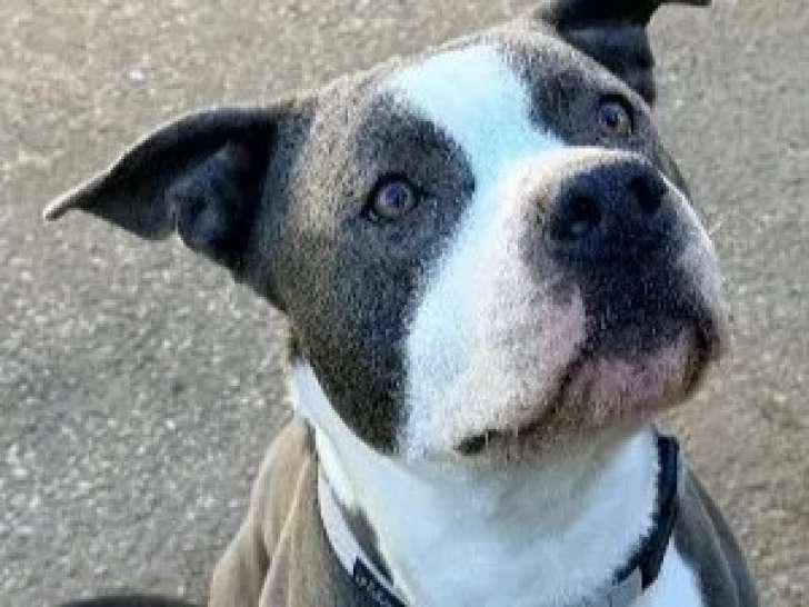 Découvrez Prime, un chien Staffordshire Américain Terrier bleu et blanc âgé de deux ans, d’un naturel gentil malgré un passé difficile, qui aspire à une vie sereine auprès de ses humains.