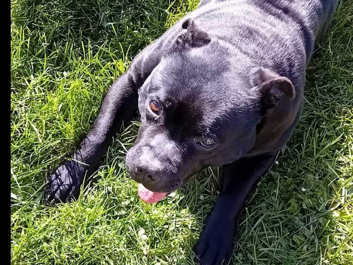 C'est avec plaisir que nous vous proposons à l'adoption Orthense, cette chienne Staffordshire Bull Terrier noire et âgée de six ans. Elle espère trouver une famille aimante qui l'aidera à se dépenser.