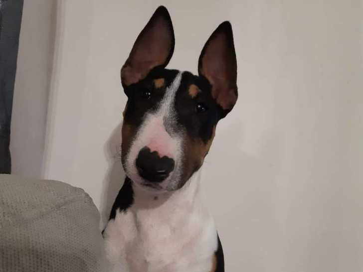 Il est âgé de cinq ans, Rocky, ce chien Bull Terrier Miniature au pelage tricolore que nous vous proposons à l'adoption. Cet animal recherche une famille sans d’autres animaux domestiques, qui continuera son éducation.