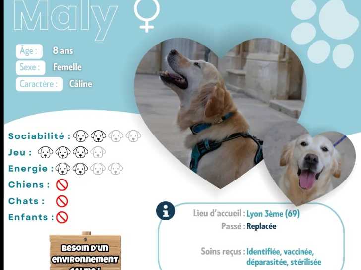 Nous vous proposons à l’adoption Maly, chienne Golden Retriever dorée âgée de huit ans, calme, propre et tendre, qui apprécie les longues promenades tranquilles et les moments de complicité avec l’humain. Elle préfère une famille sans enfants et sans d’autres animaux domestiques.