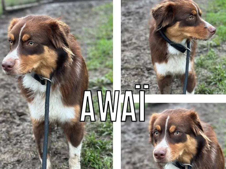 Voici Awaï, une chiot femelle Berger Australien tricolore de huit mois, réservée au début mais très affectueuse une fois en confiance. Elle s’entend avec les autres chiens mais nécessite une socialisation continue, et elle a tendance à courir après les chats.