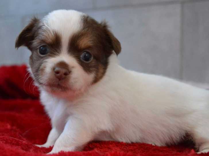 Nous proposons à la réservation 2 chiots Chihuahuas mâles : l’un est chocolat et tan, l’autre est chocolat et blanc.