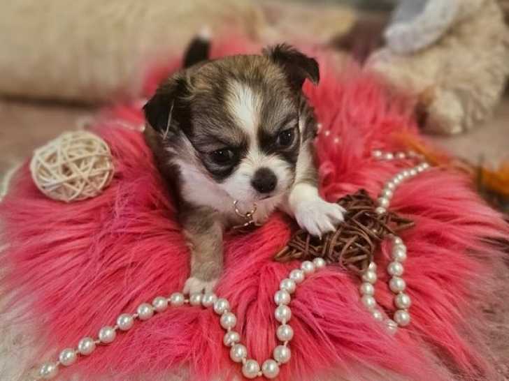 Une portée de cinq adorables Chihuahuas à poils longs est née le 20 août 2025 dans notre élevage. Nous proposons à la réservation des mâles chocolat et noir tricolore, ainsi qu'une femelle fauve pour 1200 euros...