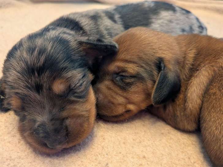 Deux femelles Teckel Nain ont vu le jour le 21 février 2026 et sont disponibles à la réservation pour 900 euros. La mère des bébés est une Teckel nain poil ras, née d'une mère Teckel nain poil dur et d'un père Teckel nain poil ras, le père des bébés étant également Teckel nain poil ras.