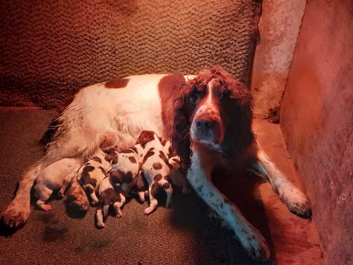 A réserver, 6 chiots English Springer Spaniel LOF. Certains sont tricolores. Ils sont issus d'une excellente lignée de travail et d'un excellent pedigree.