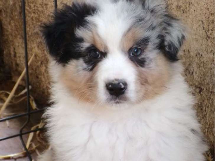 Nous vous proposons à la réservation cinq adorables chiots Berger Australien, nés le 30 décembre 2025 d'une mère bleu merle non LOF et d'un père noir tricolore yeux bleus LOF confirmé. Trois femelles et deux mâles sont disponibles à partir de début mars pour 1 000 euros chacun.