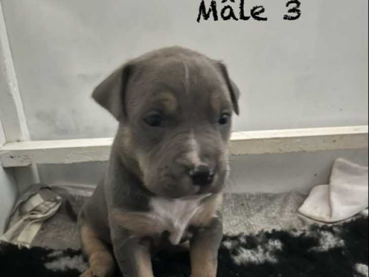 L'élevage professionnel House of American Dogs propose cinq superbes chiots American Staffordshire Terrier à la réservation. Trois mâles et deux femelles de couleurs bleu, tricolore et blue fawn cherchent leur nouveau foyer pour 1200 euros chacun.