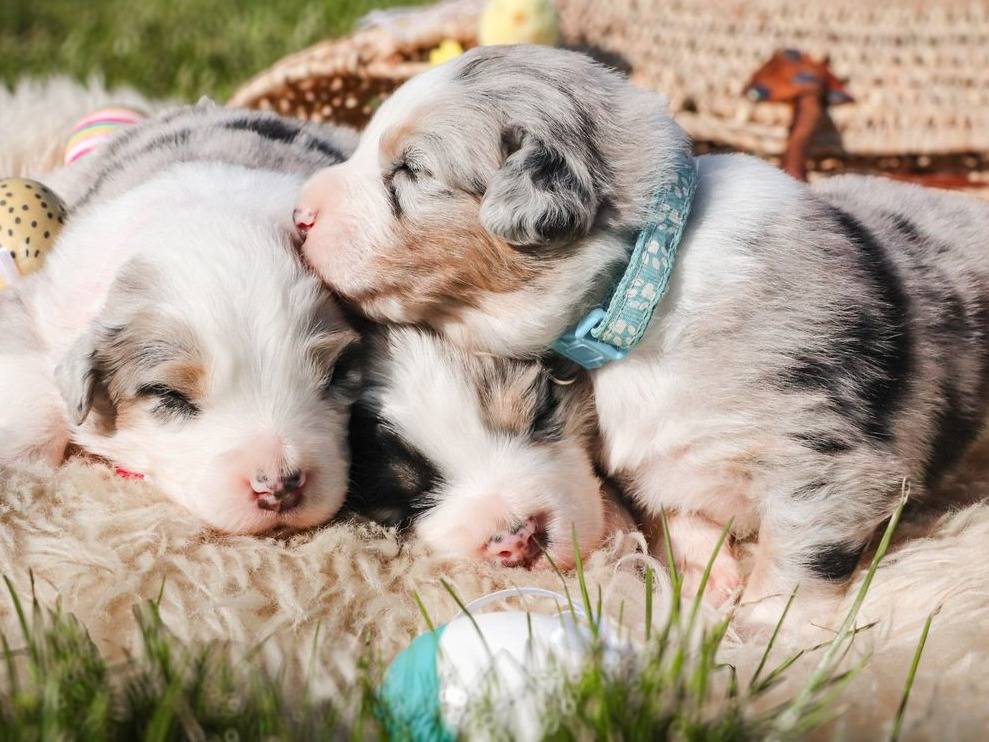 Six chiots Berger Australien sont nés le 3 mars 2026 et grandissent au sein de notre foyer. Trois mâles et trois femelles évoluent dans un environnement familial, habitués aux enfants et aux bruits du quotidien.