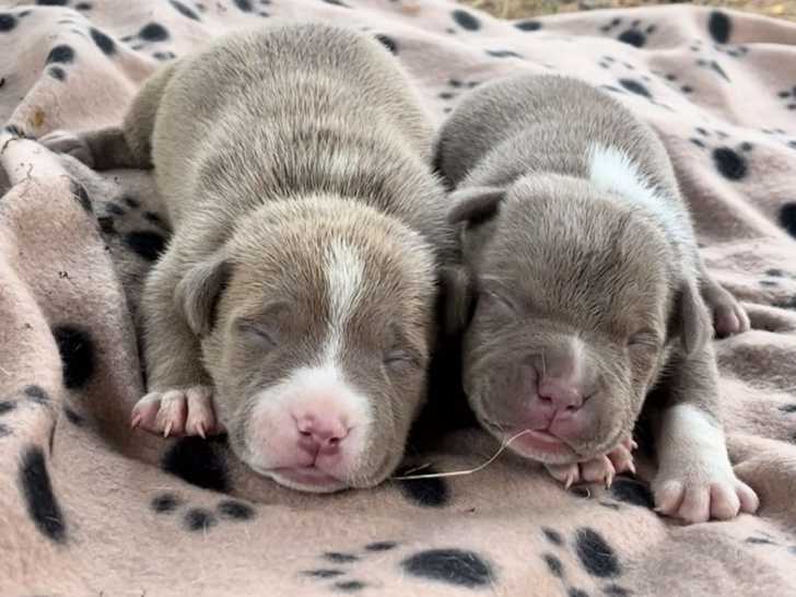 Sur une portée de sept petits American Bully qui vient de naître le 24 juillet 2022, nous proposons à la réservation cinq mâles et deux femelles. Chacun d'eux arbore un pelage bleu pan blanc ou tricolore. Ils pourront rejoindre leur famille respective à compter du 18 septembre 2022.