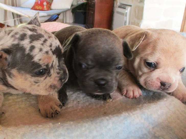 Nous vous proposons de réserver des chiots Bouledogues Français nés en 2022. Ils sont au nombre de 7 et ont au pelage merle tricolore.