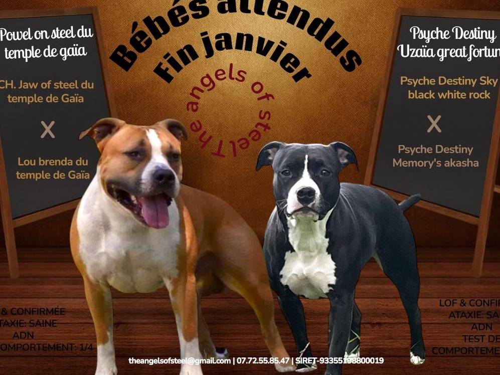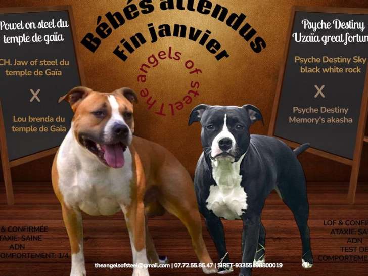 Notre élevage vous propose à la réservation de magnifiques chiots American Staffordshire Terrier, issus d'une portée née le 30 janvier 2026 de Powel et Uzaïa, lignée 100% américaine White Rock. Cinq mâles et trois femelles, tous inscrits dans le Livre des Origines Français (LOF), grandissent dans un environnement sain et stimulant, manipulés quotidiennement et habitués aux bruits du quotidien.
