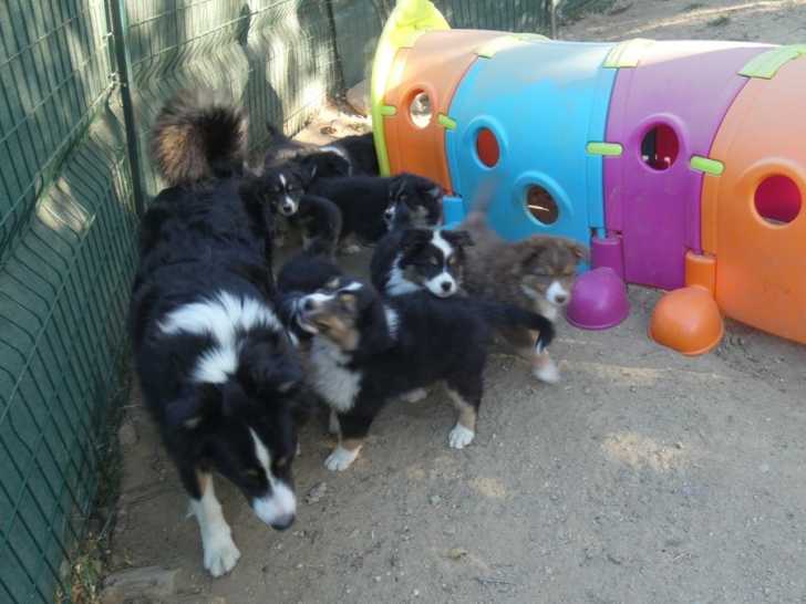 Nous avons huit chiots Bergers Australiens nés le 2 août 2025, disponibles à partir du 4 octobre 2025. Deux femelles (rouge tricolore et noire tricolore) et six mâles (bleu merle tricolore et noir tricolore) explorent déjà leur environnement familial.