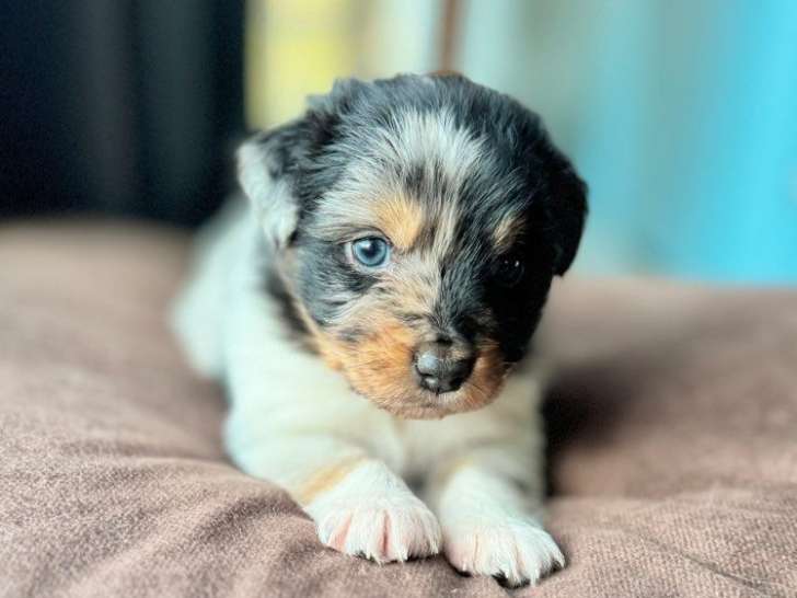 Des chiots Berger Australien sont nés le 31 janvier 2025. Il y a : - 1 mâle bleu merle(yeuxbleu) à 1000 euros ; - 1 mâles tricolores à 650 euros ; - 3 femelles tricolores à 800 euros. Un acompte sera...