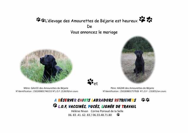 L'élevage By Champs’Or vous propose des chiots Labrador Retriever noirs et sable inscrits au LOF. Ils sont nés le 14 mai 2025. Le grand-père est multi champion. Les parents ont été sélectionnés, testés ADN...