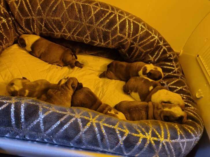 Ces adorables boules de poils de race Bulldog Anglais viennent de voir le jour au sein de l’élevage des gardiens de la Sirandale. Ce dernier a organisé la rencontre entre Lots of hugs des Dunes de Mondopale, le papa et O'Peggy la maman.