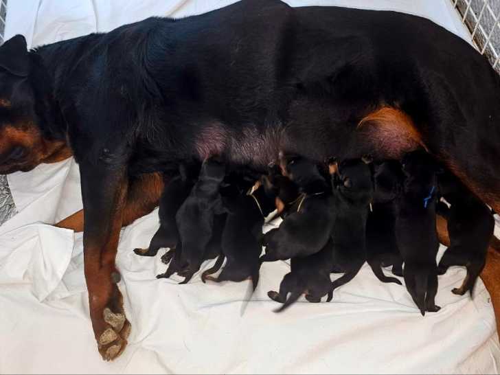 Pour 1000 euros, adoptez l'une de nos quatre magnifiques chiots femelles Rottweilers issues d'une portée de huit petits. Elles arborent la robe noire et feu caractéristique et atteindront un poids conséquent...