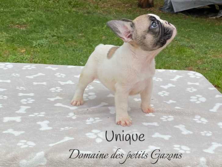 Nous mettons en vente Uanna, un chiot Bouledogue Français femelle née le 24 mars 2023 avec une robe fauve à masque noir.