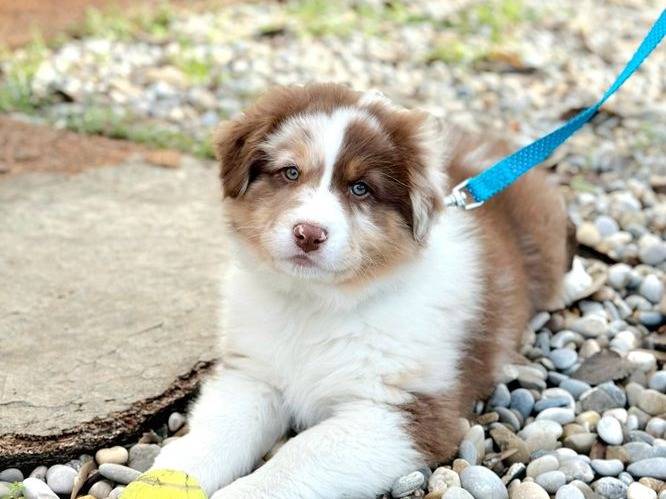 Arès Des Cascades Nacrées, un superbe mâle Berger Australien rouge merle né le 18 octobre 2025, est disponible immédiatement. Nous l'avons habitué aux chiens, aux chats et aux enfants, et il marche déjà parfaitement en laisse.