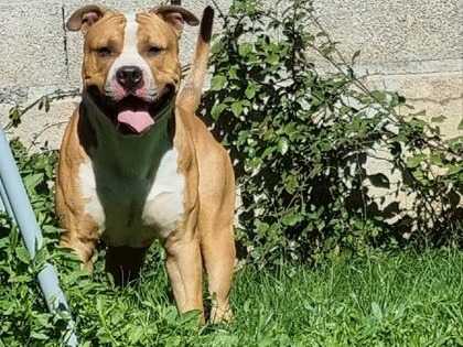 Nous cherchons une famille prête à adopter notre jeune American Staffordshire Terrier s'appelant Show. Ce chien âgé d'un an arbore un pelage bicolore et est inscrit au Livre des Origines Français (LOF).