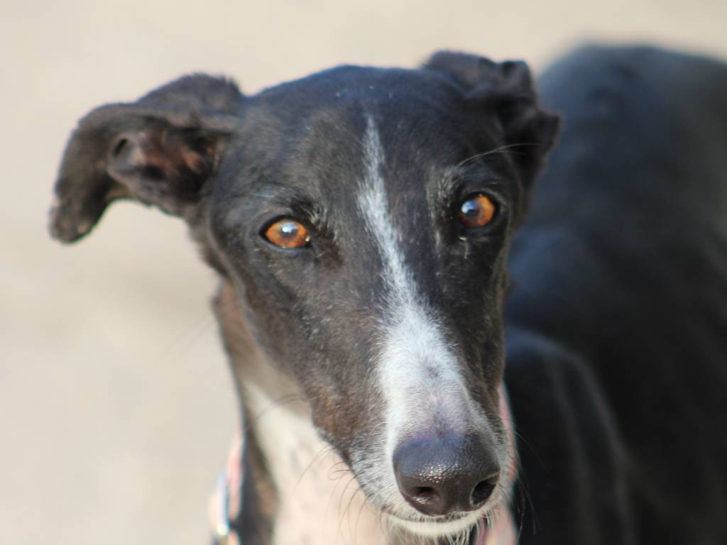 Abril, cette petite Galga Espagnole noir et blanc née en juin 2024, encore toute jeune, a été ramenée au refuge par son galguero parce qu’il dépassait le nombre d’animaux autorisés par la loi. Du jour au lendemain, elle a tout quitté.