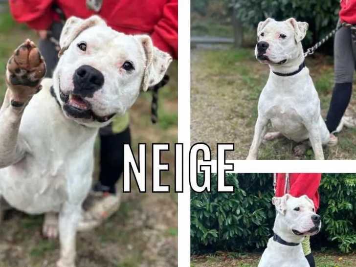 Arborée d'un pelage blanc, Neige est une chienne Bouledogue Américain âgée de huit ans que nous proposons à l'adoption. Celle-ci ne peut pas vivre avec d’autres animaux domestiques.