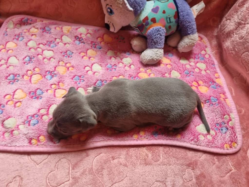Âgée de plus d’un mois, cette femelle American Staffordshire Terrier est née le 16 Janvier 2026. Elle se distingue par sa robe bleu pan blanc, aux contrastes nets et harmonieux. Son inscription au Livre des...