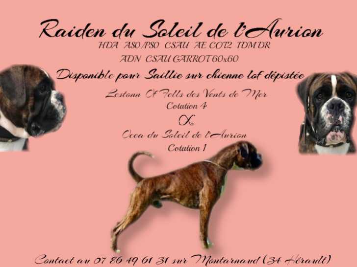 Officiellement, je m’appelle Raiden Du Soleil de L’Aurion. Je suis un magnifique Boxer bringé mâle né le 8 août 2020. Ma splendide robe fauve bringée, panachure blanche limitée, et mon masque noir mettent en valeur mon gabarit d’athlète. Mon physique de rêve, 30 kilos pour 61 centimètres au garrot, ne peut que faire craquer les louloutes femelles. Je suis issu de la rencontre entre Lestonn Of Fells Des Vents De mer et Océa Du Soleil De L’Aurion. D’ailleurs, mon test ADN confirme ma filiation. Je suis inscrit au Livre des Origines Français sous le numéro 157886.