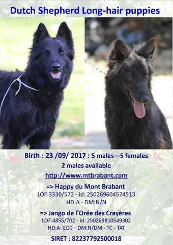 Quelques chiots Berger Hollandais poil court recherchent leur famille. Nés le 31 août 2025, ces mâles et femelles de couleurs variées sont proposés pour 950 euros chacun. Ils partent vaccinés, pucés et...