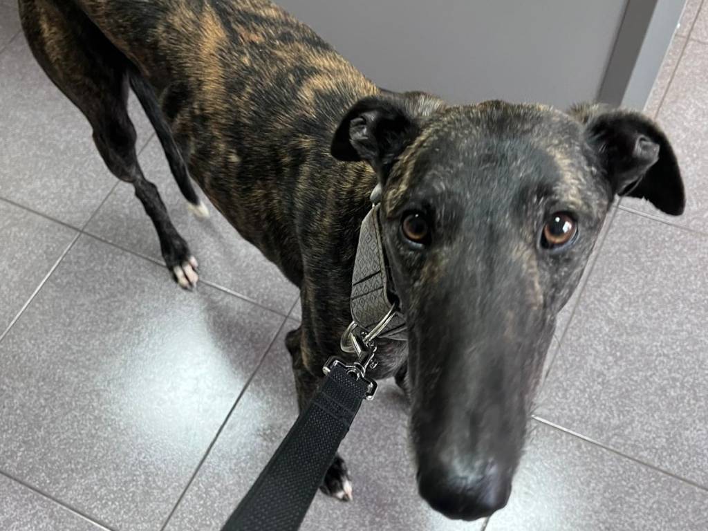 Cesar, notre magnifique Galgo bringé (robe tigrée), est un jeune mâle né en août 2023, au regard doux et intelligent.